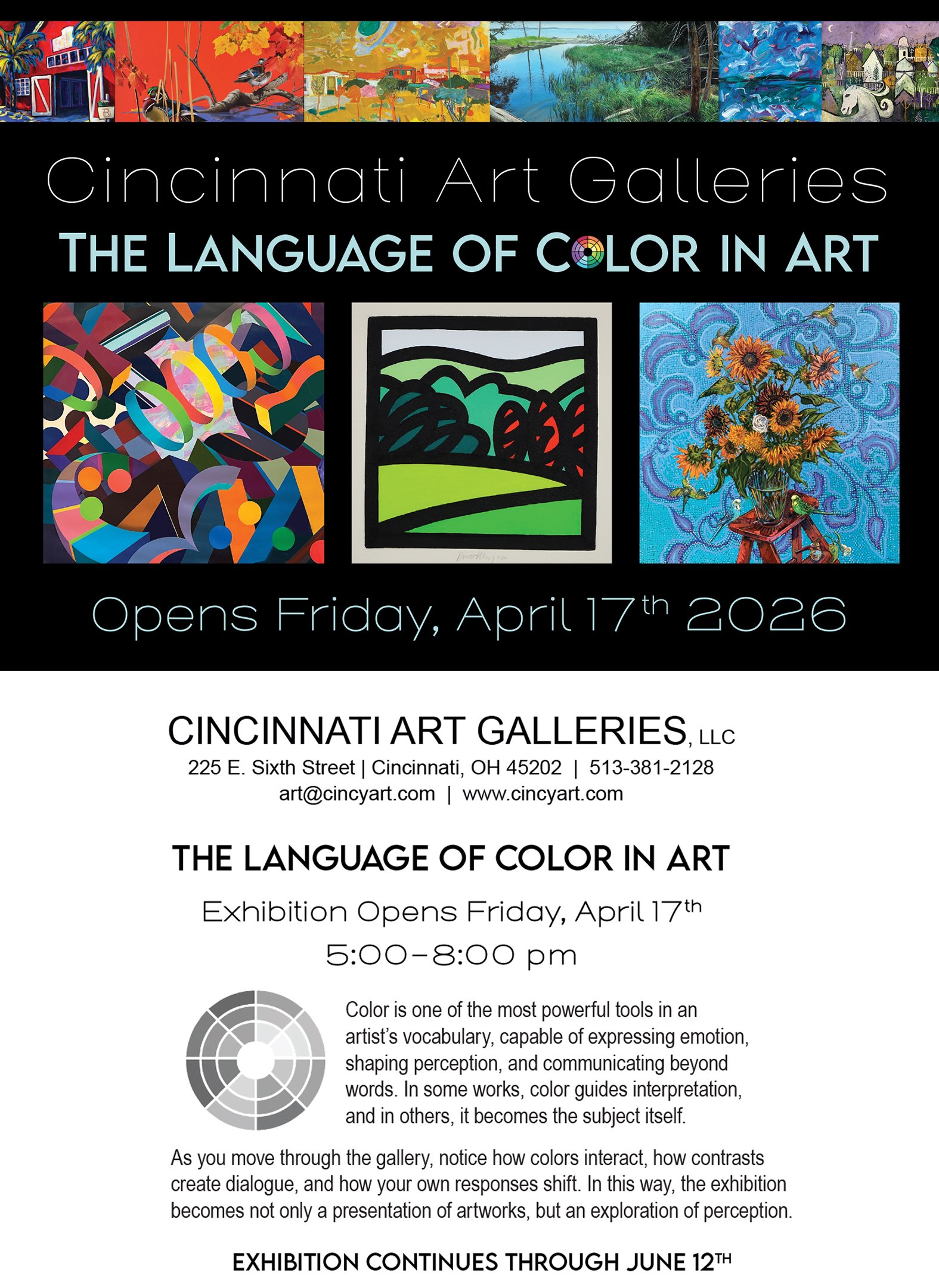The Language of Color in Art Friday, April 17, 2026 5:00 PM 8:00 PM 17:00 20:00 Cincinnati Art Galleries, LLC 225 E 6th St Cincinnati, OH, 45202 United States (map) Google Calendar ICS